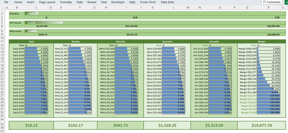 On the 'Passive Income Challenge' home page, you have a list of your current investments, a monthly calendar grand totaling your income by month, and progress charts showing your annual household progress, and your goals progress broken down by day, week, month, quarter, year, and more.